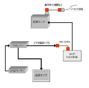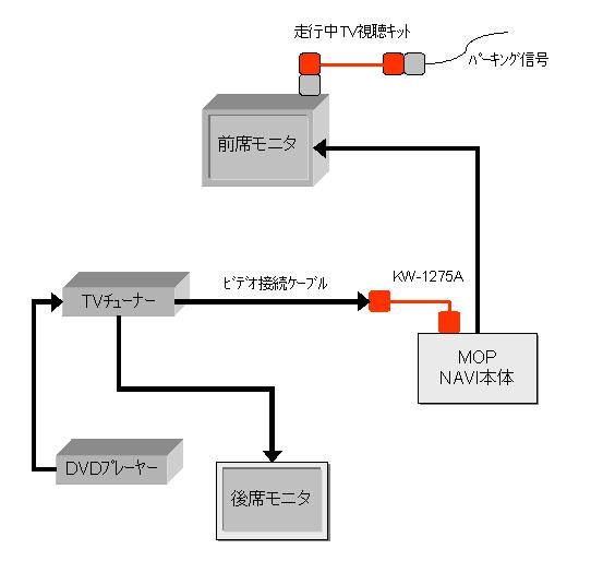 基本的には、後ろの席で子供達がTVとDVDを見る事を前提として考えましたので、フロントとは完全に独立したシステムを導入しました。が、やはり、せっかくのDVDソースを助手席でも楽しみたいとの思いもあったので、別途ケーブルを引っ張りMOPナビの外部入力から取り込む事にしました。MOPナビは、FUJITSU