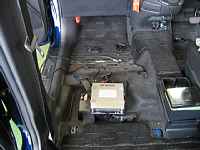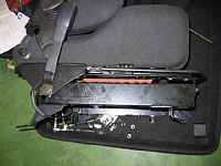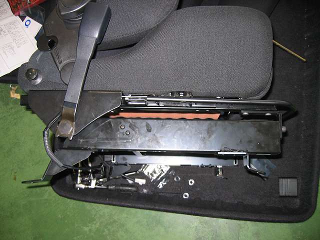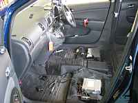 ついに運転席も外されました。あれがMOPナビ本体です。後述しますが、ナビを覆っている黒いカバー(後方)が、ベースフレームとニアミス..というか接触してしまうことになろうとは、このときには思いもしませんでした。^^