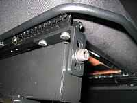 右側の画像が、シートの高さを3段階に調整するためのネジです。シートの4隅に4箇所あります。ちなみに、よ〜く見ていただくとわかるかと思いますが、この高さ調整自体は、シート下のクリアランスには一切関係がありません。撮影したときは、ちょうど真ん中に設定されていますが、最終的に一番低く設定してもらいました。