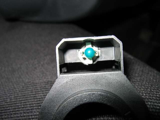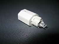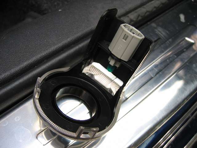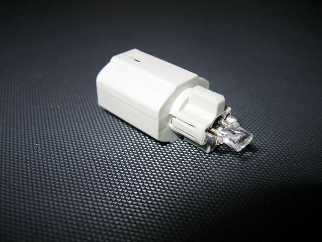 ちなみに、このソケットの取り外し方は、通常のバルブ同様につまんで左側にひねると簡単に抜けます。ちょっと固いかもしれませんが、ラジオペンチなどで軽くはさみながら回せば楽勝だと思います。あとは、購入した商品をそのまま取り付け、外したのと逆手順にて元に戻します。え〜と、これを書きながらどうしても思い出せないのですが、ソケットにささっていたコネクタって向きがあったかな..ということです。普通に考えたら絶対に向きがあるように思いますが...ちょっと不安ですので、実際に取り付けをされる方は、コネクタを繋いだ時にLEDが点灯することを確認して下さい。おそらく運転席側ドアを開けての作業になると思いますので、コネクタを挿した瞬間に点灯するはずです。...あっ...電気系を触るときには、本来はバッテリーのマイナス端子を外して作業するのが安全ですので、外して作業されている方は、ここで一度マイナスを繋いで、点灯を確認した後、カバーを戻すようにした方が良いでしょう。^^