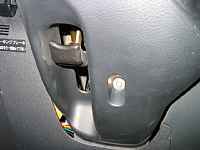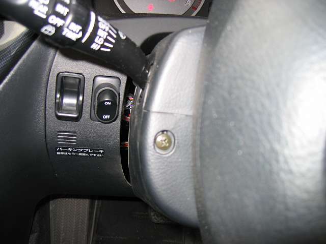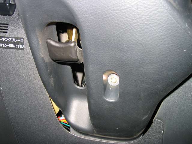 キーシリンダ部を露出させるには、ステアリング周辺のネジを3箇所外します。まずは、ステアリング左右の付け根に付いているネジです。このネジを外すには、エンジンを掛けてステアリングを切った状態でないとステアリング自体が邪魔になりネジが外せませんので注意して下さい。(しばらく気付かなかったのは私だけかも^^)