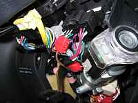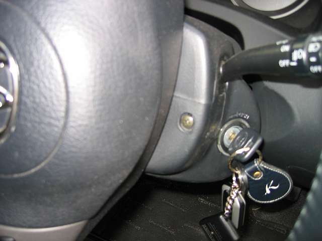 3つ目のネジはステアリングの下部にあります。ちなみにネジは3つともプラスです。ネジさえ外してしまえば、後はそんなに力を入れなくてもカバーが外れます。右側の画像はカバーを外してキーシリンダ部を露出させた状態です。