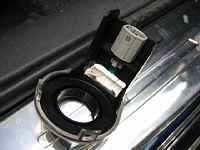 キーシリンダ部露出画像の右側に写っている透明なカバーは左右どちらかにまわすと簡単に外れます。ソケットにささっているコネクタもついでに外します。左側の画像が、外したカバーです。おっ...どこかで見たようなブツが写ってますね。そうです。^^