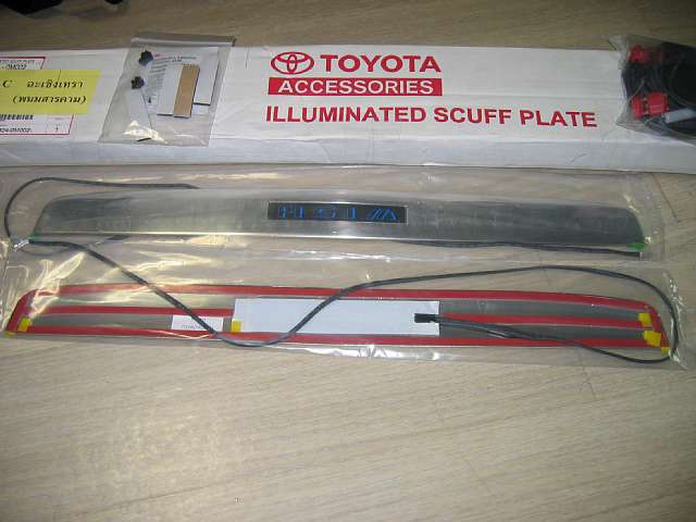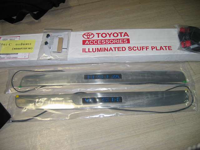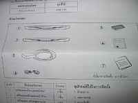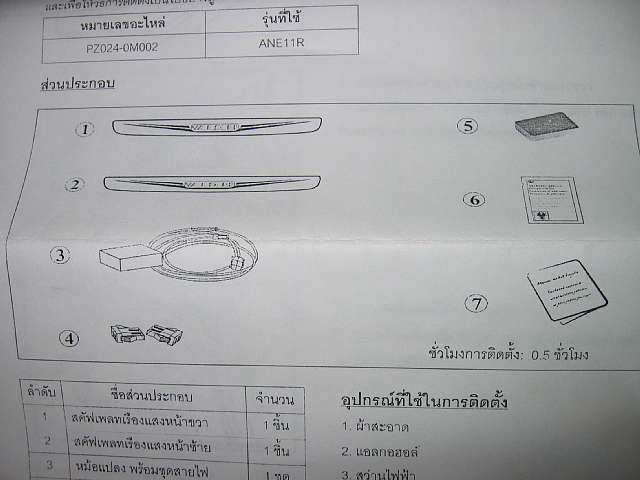 ついに入手しました。^^ スカッフプレートは既に付いていますが、なぜ国内版はEL付きが設定されていないんでしょうね〜。これも、タイ在住の日本人でwishオーナーでもある、秘密商人の(嘘爆)miさんのおかげです。本当に感謝しております。^^ miさん、ありがとう〜! これが箱に含まれる部品です。思ったよりも薄く感じます。^^ プレート本体以外に、配線やコネクタ、説明書などが付属しています。スカッフプレート自体は、両面テープにて本体に取り付けするようですね。既に付いているプレートを外した後で、代わりに取り付ける...のかな。^^ これが付属の説明書です。当然タイ語です。まったく読めません(自爆) が、右画像のように図解が多く含まれていますので、取り付けは何とかなりそうです。^^ 実は、まだ入手直後で取り付けを行っていません。取り付け作業をする際の様子、取り付け後の様子などは、作業後にレポートさせて頂きたいと思います。しばしお待ちを...^^