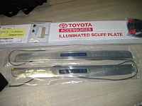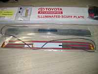 これが箱に含まれる部品です。思ったよりも薄く感じます。^^ プレート本体以外に、配線やコネクタ、説明書などが付属しています。スカッフプレート自体は、両面テープにて本体に取り付けするようですね。既に付いているプレートを外した後で、代わりに取り付ける...のかな。^^