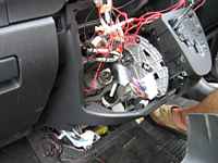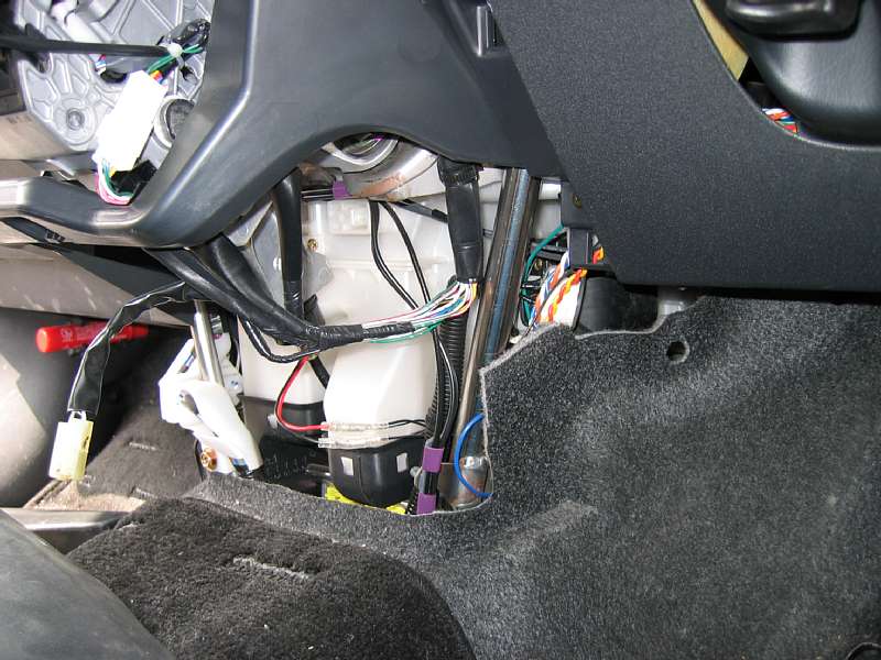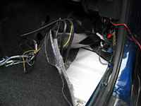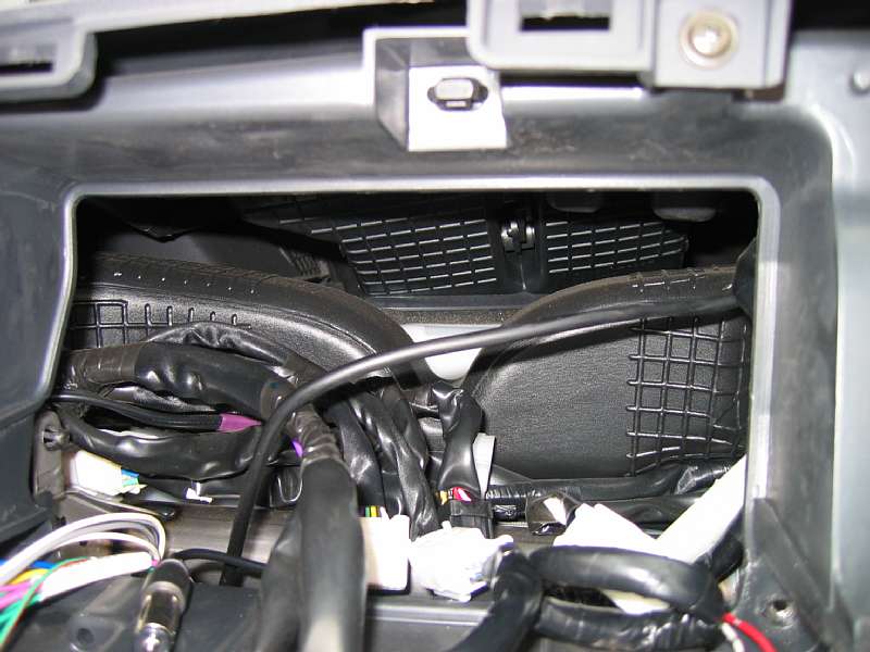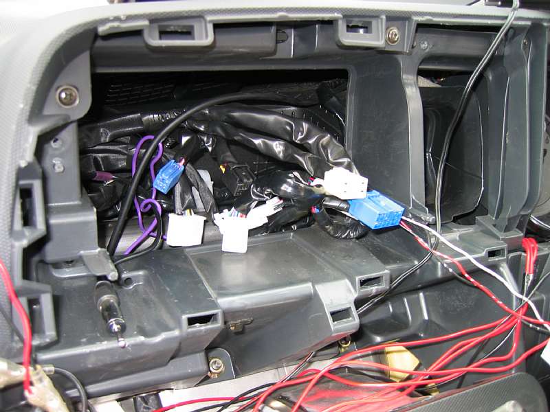 私は運転席下のMOPナビの上に設置することになりましたので、運転席下の床を引っぺがし、その下に配線をすることにしました(なりました^^)。で、ケーブルにもそれなりの長さの制限がありますので、インパネのナビの後ろまで持っていくためにフロントパネルも結構下の方まで外しての作業です。^^