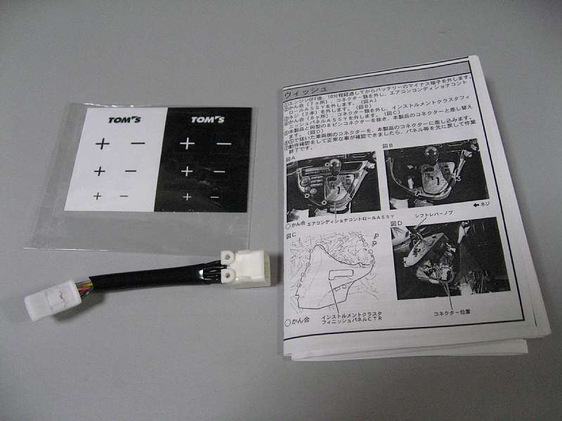 添付品は右写真が全てです。wish専用ではありませんので、+−シールが複数の大きさで色も色黒の2種類が付いています。また取説には適合車種分の装着方法が記載されています。ちょうど上の写真はwishの解説部分の全てが写っています。にしても、しょうがないけど残念なのは、+−のインジケータは夜間は照明が入って光るようになっていますが、シール貼ってしまうと夜間は見えなくなっちゃうとことです。説明書にも記載されていますが、GTシフター装着後はシールも貼っておかないと整備不良になるそうです。まっ..そこまでは車検でも確認しないような気もしますが..。^^