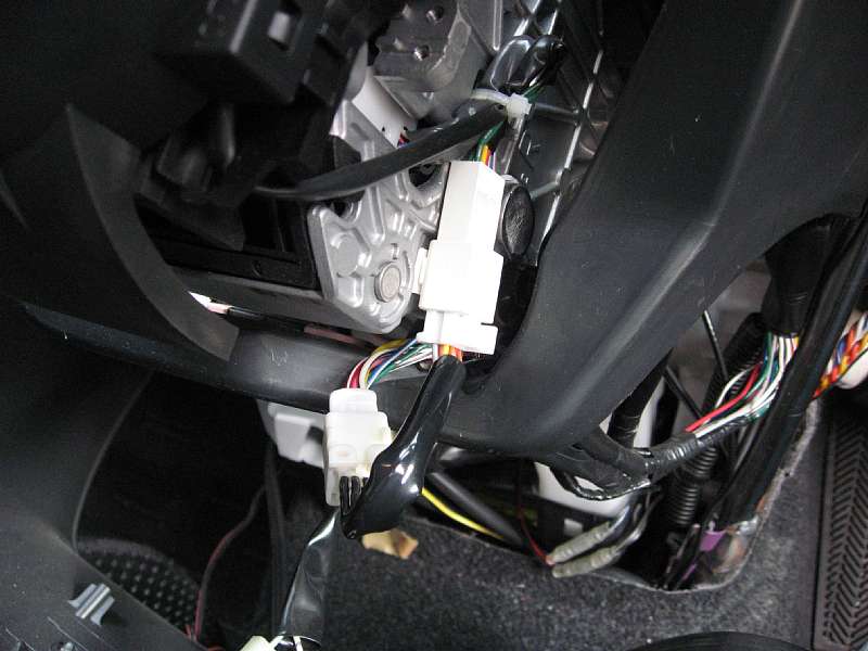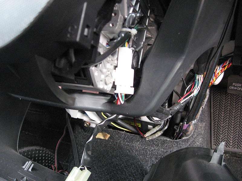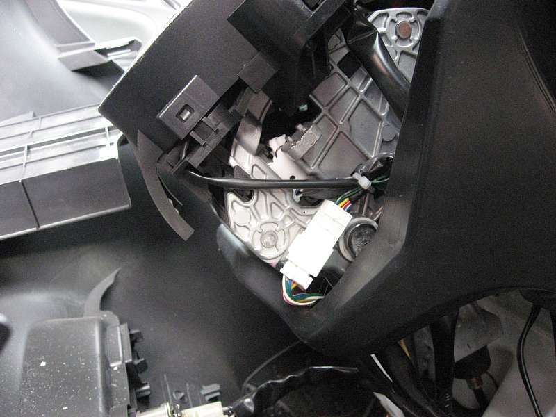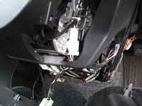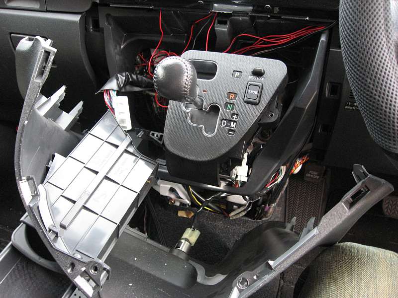 で、ネジを外すと右画像のようにさらに下のパネルを手前に引っ張って外します。ここでようやくGTシフターを割り込ませる白いコネクタが現れました。ちなみにこのパネルを外す際は、運転席、助手席間の盛り上がった部分のシートマットが邪魔になると思いますので事前にマットを外しておくとよいです。