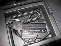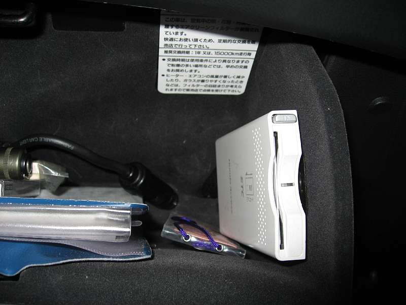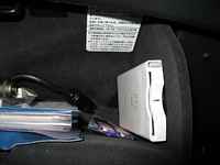 上記画像が、センターコンソールに設置したアダプタです。元々浅い構造になっていますので、物入れとしてはあまり使えないと思っていたのですが、これを入れるにはちょうどの大きさですかね。物入れの後方部分にケーブル接続用のコネクタが標準装備されていますので、こちらにディーラオプションの「インターナビハンズフリーTELコード/PDC方式用」を接続し、ケーブルの反対側をアダプタに接続します。アダプタの反対側から出ているケーブルはFOMA用ケーブルになっていますので、後はFOMAを接続すれば完了です。あっ....このアダプタは別に電源が必要ですので、シガーソケットから電源をとります。メーカオプションHDDナビ装着車にはセンターコンソールの後部席側に、ビデオ入力端子とともにシガーシケットがありますので、こちらから電源をとります。ちなみに、このアダプタ、これだけではFOMA接続時に充電はしてくれないのですが、市販のFOMA充電ケーブル(ダイソーとかで300円で売ってるものでも充電できました^^)を同時に接続することで充電も合わせてやってくれますので便利です。ケーブルだらけにはなっちゃいますが...^^