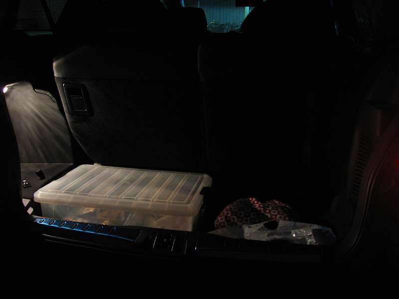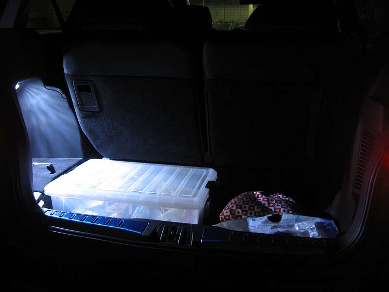 実際の装着画像です。カーゴランプのカバーを内装外しなどで取り外し、純正球を外して交換するだけです。ちなみに純正の電球はどれも同じですが、明るさを比較するためにしばらく点灯させておいたら、手で触れなくなるほど高温になります。例によって夜間の交換は避けた方が良いかと。^^