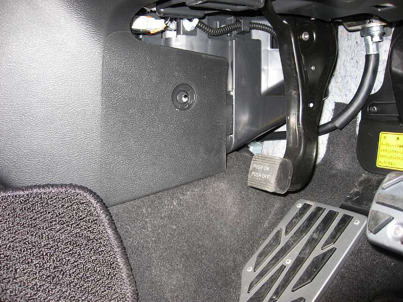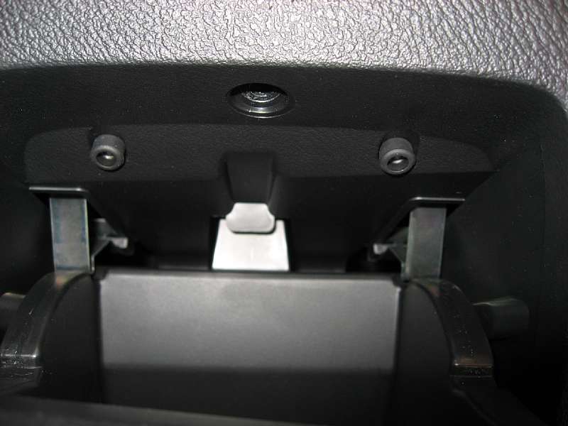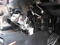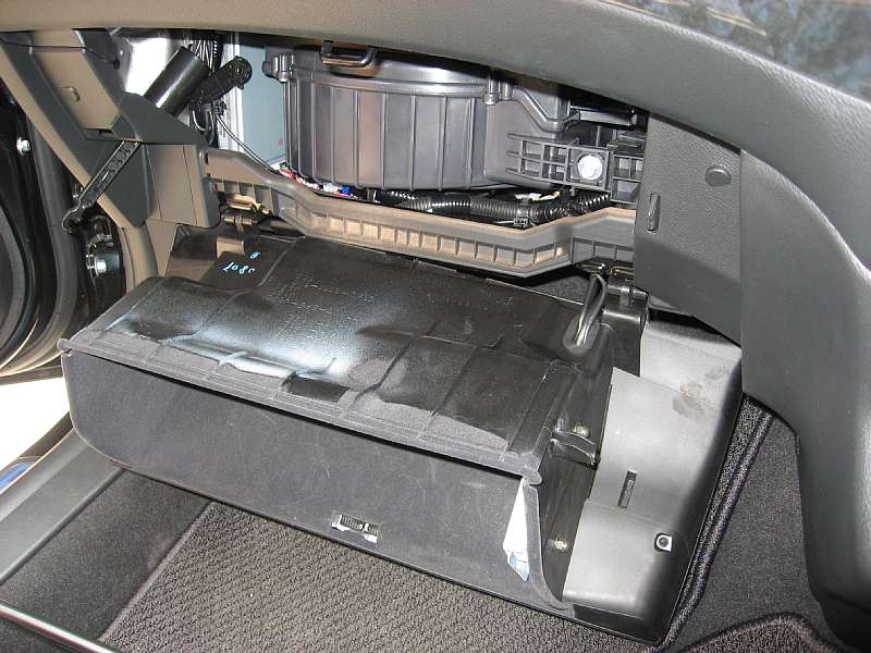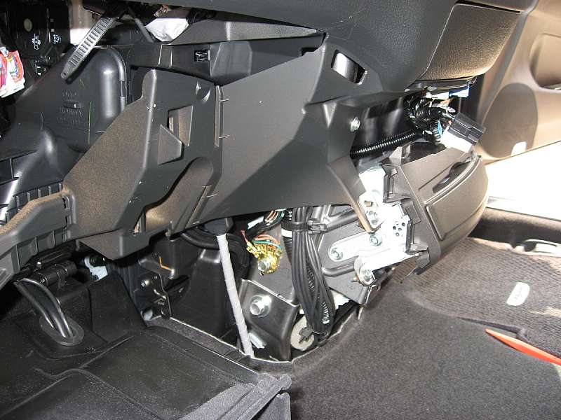 インパネを外すには、まずグローブボックスからはじめます。中の物を一旦退避して、空になったグローブボックスの側面を内側にちょっと強く押さえると両脇が外れ画像のようになります。画像左上に黒いアームのようなものが見えますが、この先端もグローブボックスに引っ掛かっているので外します。で、実際には下部でネジ2本で固定されていますので、作業の邪魔と思ったら外してから作業した方が良いと思いますが、私はこのまま作業しました。^^