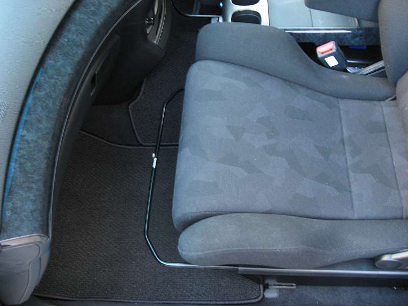 RECARO純正ベースフレームのスライドバーは画像右側のように結構前方に張り出しています。画像だけ見ると邪魔なように見えますが、ポジションの関係か実際にはまったく邪魔にはなりません。もっとも座席下にもぐって作業とかする時には結構邪魔になりますが...^^